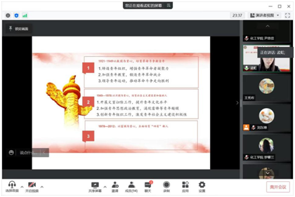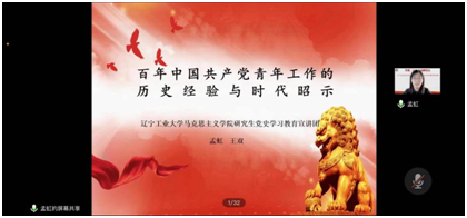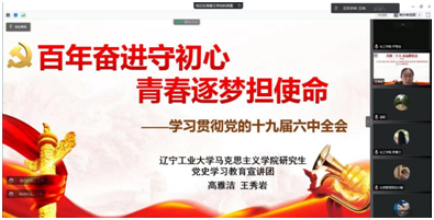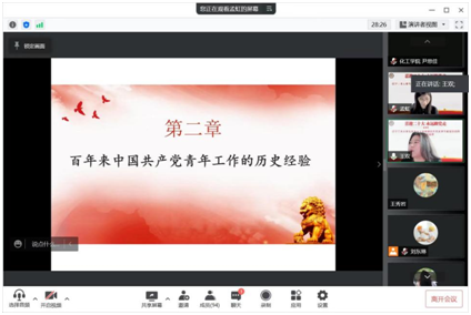 为全面学习贯彻党的十九届六中全会精神精神,深入感悟党领导中国青年运动的光辉历程,4月27日下午,校团委邀请BB贝博艾弗森官网研究生党史学习教育宣讲团成员为公司“青马工程”骨干班学员开展线上宣讲。