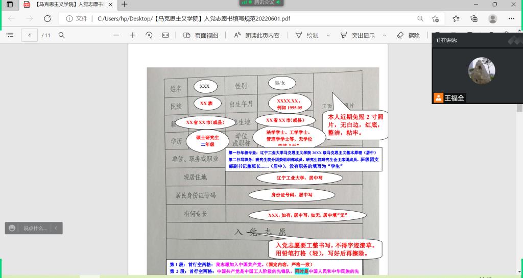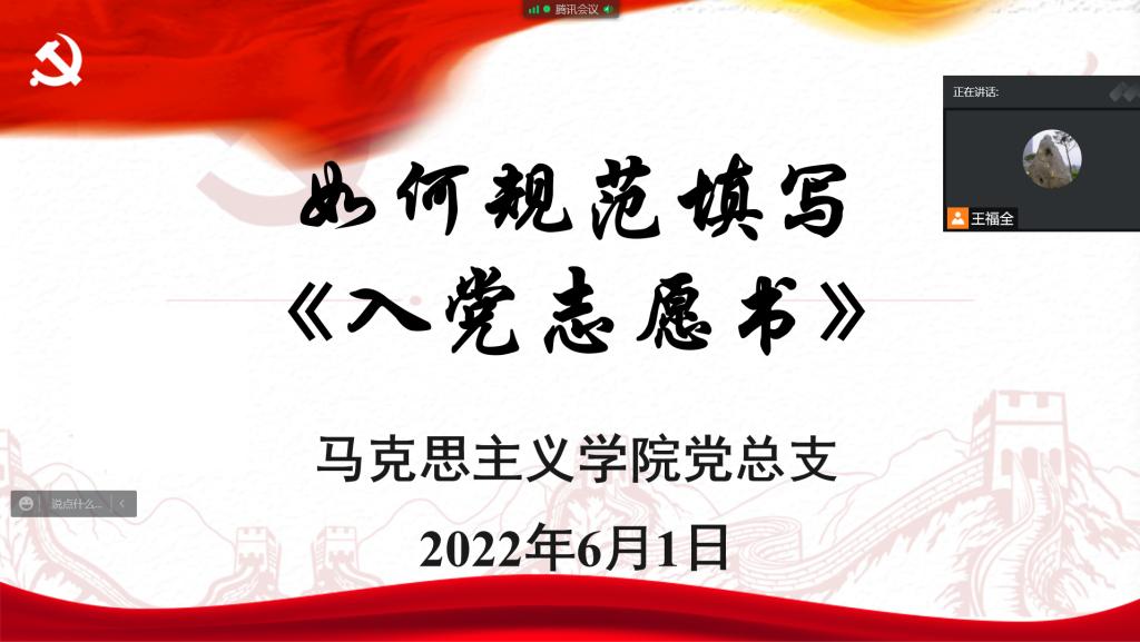 为进一步加强对党员发展对象的培养和教育,确保党员发展档案材料规范,6月1日上午10:00,公司党总支通过以线上、线下结合的形式举办《入党志愿书》规范填写指导培训会。公司第十七期6名研究生党员发展对象、支委全体成员参加了培训会,其中4名发展对象在公司3-337党员活动室线下参会,另外2名发展对象和支委成员通过腾讯会议线上参会。培训会由公司党总支专职组织员王福全主讲。