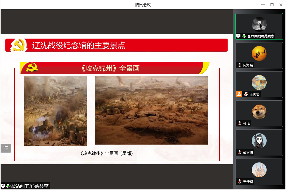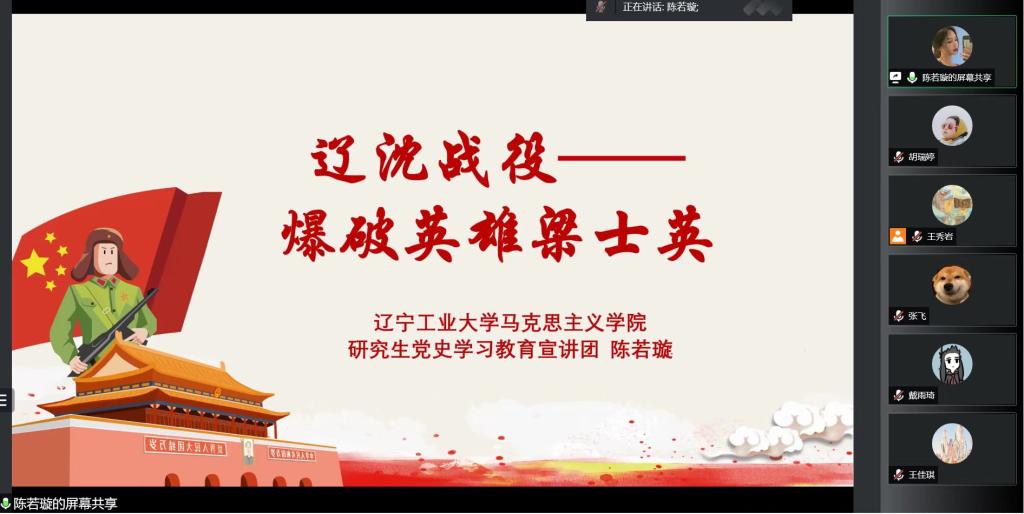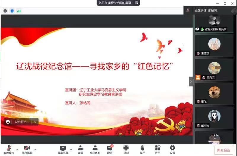 张站闻做了《辽沈战役纪念馆——寻找家乡的红色记忆》的主题宣讲。他介绍了辽沈战役纪念馆的基本情况、主要景点以及辽沈战役纪念馆的“前世”与“今生”,展示了馆内纪念塔、纪念碑、全景画馆等重要红色文化载体,带领同学们深刻体会了中国人民解放军不怕牺牲、不屈不挠、前仆后继的高度革命热忱和崇高革命英雄主义精神,给同学们上了一堂生动的党课。百年沧桑,硝烟散尽,但重温辽沈战役历史,仍然给予我们深刻思考,更赋予我们前行的力量,青年一代肩负着把党的历史挖掘好、总结好、传承好的历史重任,我们要继承先烈遗志,发扬革命传统,汲取奋进力量。