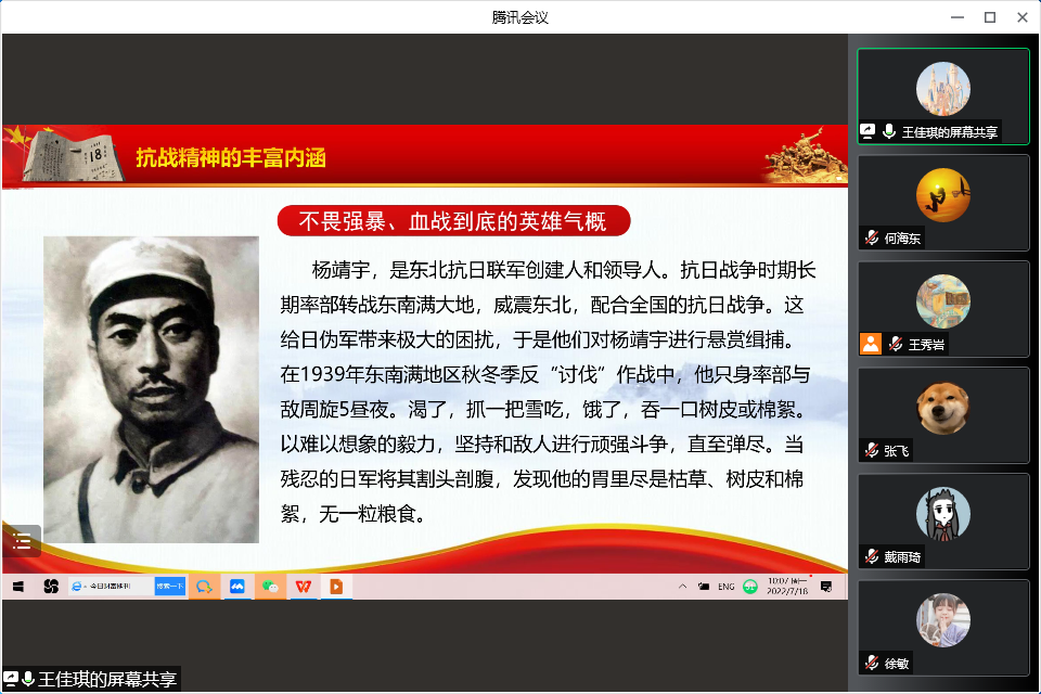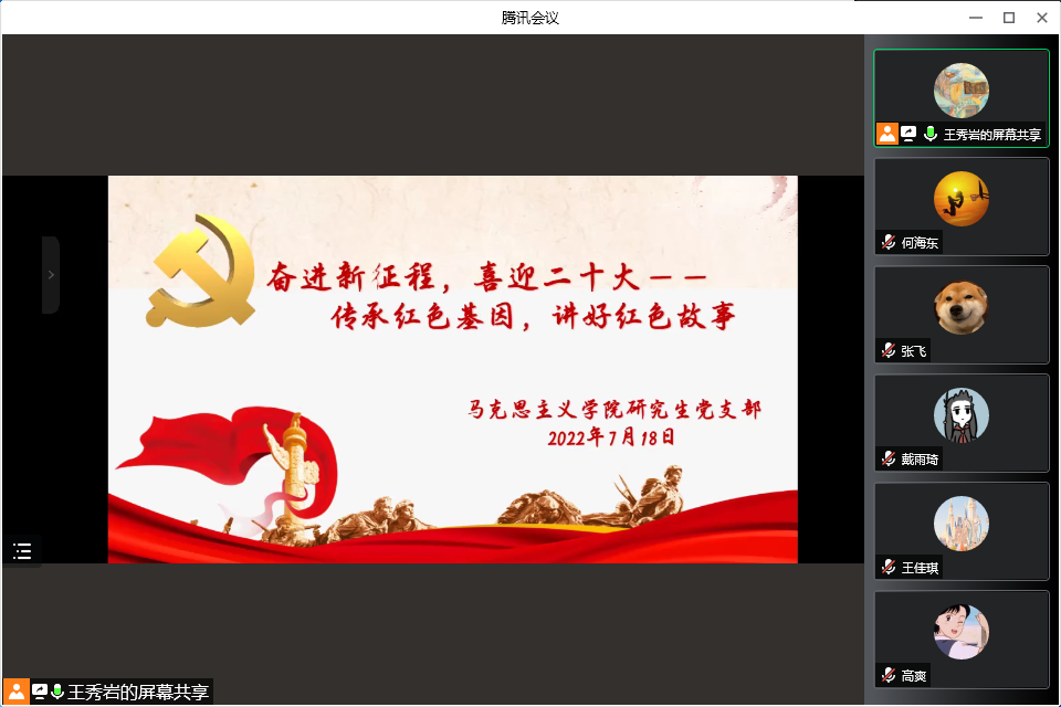 为推动党史学习教育常态化制度化长效化,迎接党的二十大胜利召开,7月18日上午,公司研究生党支部在腾讯会议举办“奋进新征程 喜迎二十大——传承红色基因,讲好红色故事”理论宣讲主题党日活动。此次活动,由公司6名研究生党史学习教育宣讲团成员通过“云端”向大家介绍家乡的红色文化,宣讲红色精神。公司党总支书记孟令红老师、研究生党支部党员及积极分子共54人全程参与此次活动。活动由研究生党支部书记王秀岩主持。