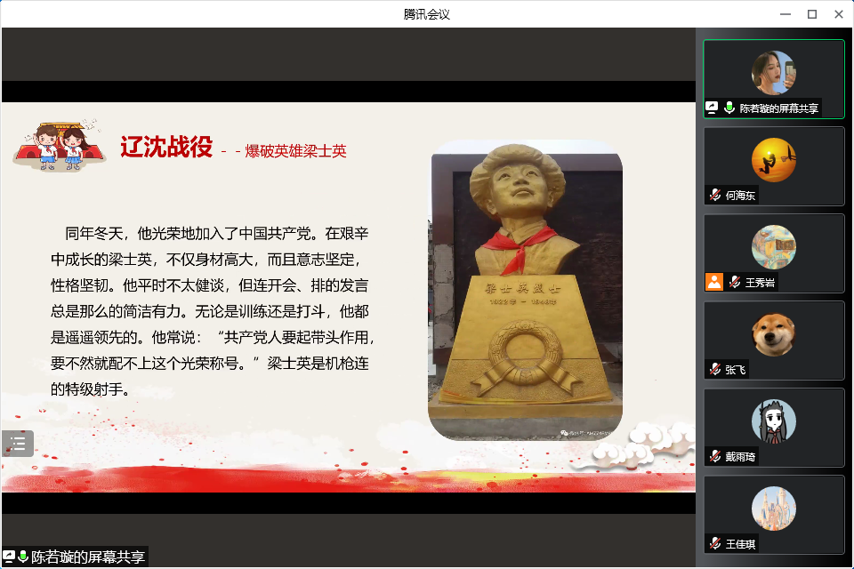 陈若璇以《辽沈战役——爆破英雄梁士英的故事》为主题开展宣讲。她介绍了辽沈战役特等功臣、革命英雄梁士英出身贫苦、光荣参军、青年入党、屡立战功直至壮烈牺牲的短暂而辉煌的一生,诠释了中国人民解放军舍生忘死、不怕牺牲、勇往无前的大无畏精神,作为当代研究生,要继承和发扬革命传统,珍惜机会,抓住机遇,刻苦学习真知识,苦练真本领,锻炼意志,陶冶情操,全面发展,努力成长为堪当民族复兴重任的时代新人。