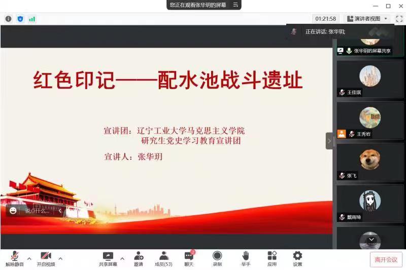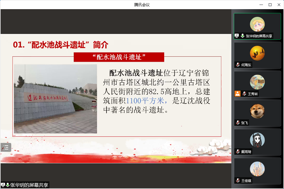 张华玥做了《红色印记——配水池战斗遗址》的主题宣讲。她用图文并茂的形式还原了当时这场战斗的惨烈,使同学们了解到配水池战斗是辽沈战役中的关键一战,东北野战军浴血奋战、奋勇杀敌,经10小时的激战,攻取配水池,从而打开了通向攻克锦州的胜利道路,为辽沈战役的最终胜利奠定了坚实基础,也了解了“配水池是第二个凡尔登”、“攻配水池的都是打铁的汉”等一系列口号的由来,从战斗遗址上密密麻麻的弹孔中更能体会到当今幸福生活的来之不易,给同学们上了一堂生动的党史学习教育课。