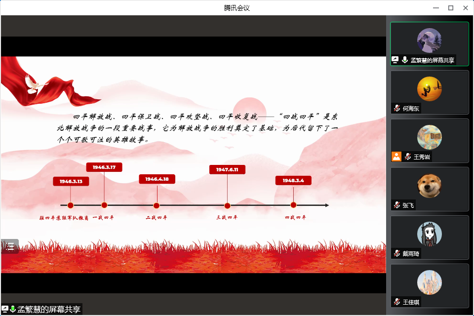 孟繁慧做了《传承四战四平精神,书写时代振兴篇章》的主题宣讲。她讲道,四平战役是东北解放战争中一段重要的战事,其以血与火的生死搏杀,锤炼了东北人民解放军正规化作战能力,锻造了“听党指挥、敢于胜利、根植人民、一往无前”的四战四平精神,为人民解放军控制东北战场局势、打击国民党军有生力量、解放东北及全中国奠定了基础。今天,在全面建设社会主义现代化国家新征程的新的“赶考路”上,我们弘扬四战四平精神,就是要全面加强党的领导,不断增强“四个意识”、坚定“四个自信”、坚决做到“两个维护”,传承共产党人的英雄本色,牢记党员初心使命,在攻坚克难中认真答好振兴发展的考卷。