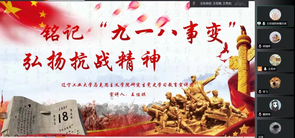 王佳琪以《铭记“九一八事变” 弘扬抗战精神》为主题进行宣讲。她结合“九一八事变”这段悲壮的历史,具体介绍了抗战精神的丰富内涵,阐释了中国人民向世界展示的天下兴亡、匹夫有责的爱国情怀,视死如归、宁死不屈的民族气节,不畏强暴、血战到底的英雄气概,百折不挠、坚忍不拔的必胜信念,使同学们深刻领悟了抗战精神的时代价值。不忘国耻方可奋发图强,铭记历史才能开创未来,在具有许多新的历史特点的伟大斗争中,只有弘扬和传承伟大抗战精神,万众一心,众志成城,坚定不移向着既定目标扎实迈进,才能在新的历史起点和时代舞台上开创中华民族伟大复兴的新境界。