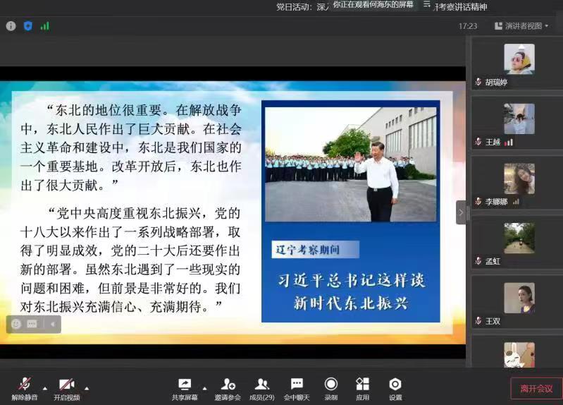 党支部宣传委员何海东以《深入学习习近平总书记在锦州调研考察讲话精神》为主题,首先讲述习近平总书记参观辽沈战役纪念馆,回顾东北解放战争历史和辽沈战役胜利进程,追忆广大人民群众支援前线的感人事迹和革命先烈不畏牺牲的英雄事迹;其次,他介绍了习近平总书记考察东湖公园的生态环境修复情况,总书记表示看到锦州的变化后感到很欣慰,并且呼吁大家要增强保护生态、爱护环境的意识,共同守好自己的家园,努力保护好这座英雄的城市,充满历史文化底蕴的城市。