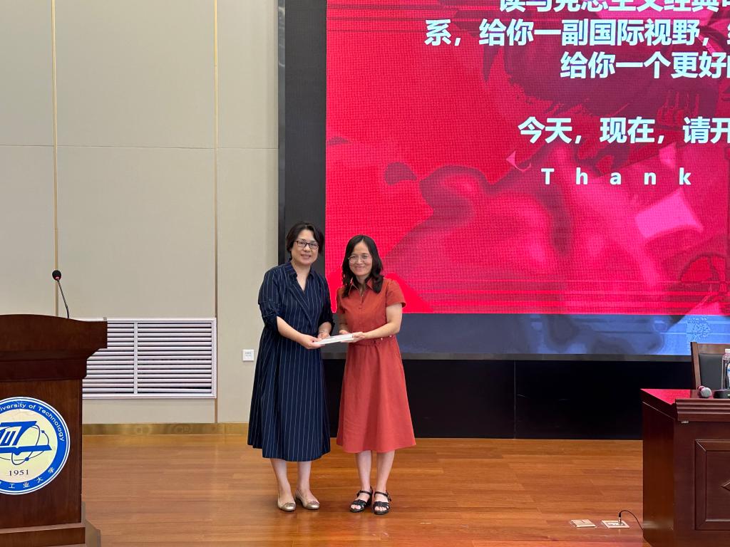 讲座结束后,金梦兰博士将自己的著作《马克思恩格斯经典文献精选·精读·精解》50本赠予公司,作为公司研究生的经典导读用书及公司教师的理论研究资料。公司经理张卫平代表公司师生接书并对金梦兰博士表示由衷感谢。