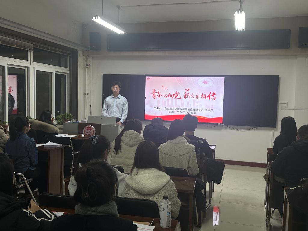 12月16日,公司研究生党支部书记位宇洋在第三教学楼816教室为支部全体党员讲授《青春心向党 薪火永相传》专题党课。